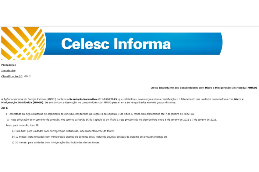O e-mail que você recebeu é um informativo sobre a aplicação da Lei Federal nº 14.300/2022, conhecida como o Marco Legal da Micro e Minigeração Distribuída. Esta lei estabeleceu novas regras para o setor em todo o Brasil. A Resolução Normativa nº 1.059/2023 da ANEEL apenas detalhou como as distribuidoras, como a Celesc, deveriam aplicar essa lei.